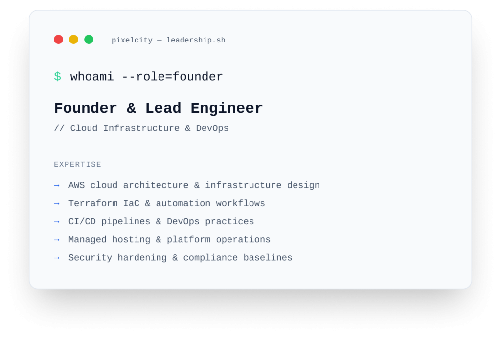 PixelCity LLC is a registered Limited Liability Company (LLC) in the State of California, United States. The company provides cloud infrastructure, DevOps consulting, managed hosting solutions, and web technology services for startups and growing businesses.