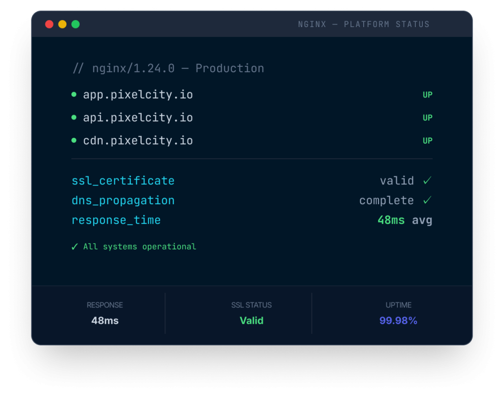 A continuous managed service that keeps your platform running at peak performance with proactive monitoring, DNS management, and ongoing operational support.